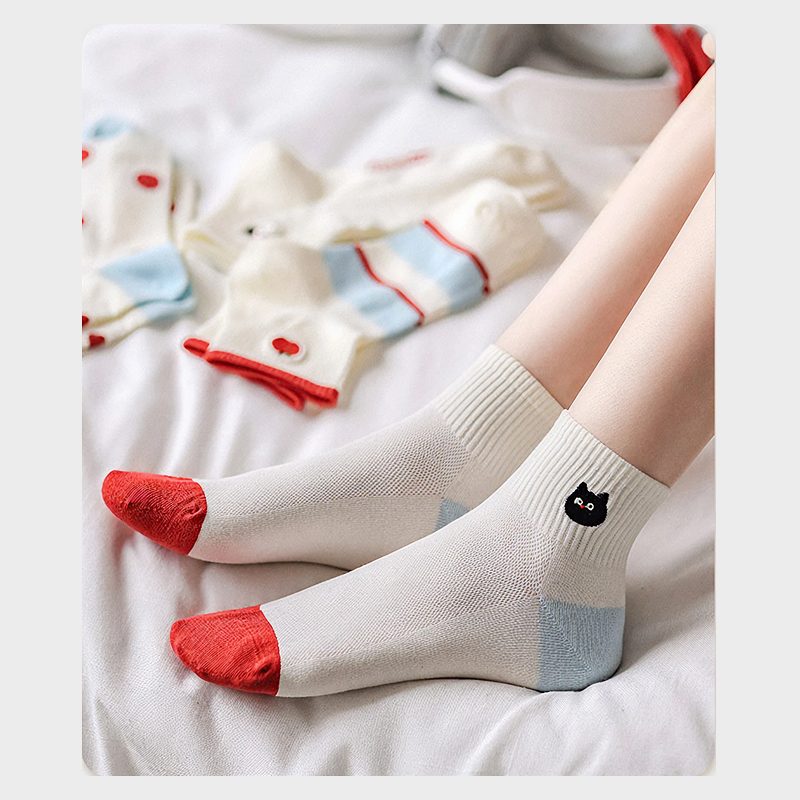 Women’s Thin Cotton Socks – Cute Cartoon Kitten Embroidery, Red & Blue Striped Mid-Calf Socks